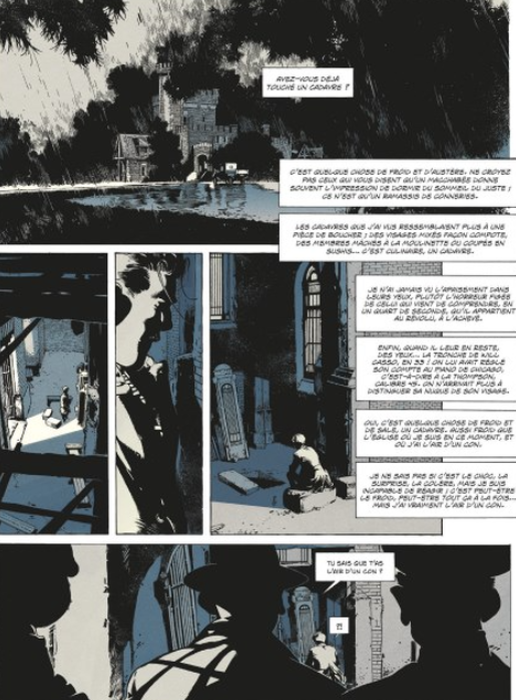 Pierwszą częścią trylogii jest album Quelque chose de froid, krwawa opowieść kryminalna z akcją osadzoną w 1936 roku w Ohio. Przykładowe plansze z tego komiksu na stronie wydawcy.